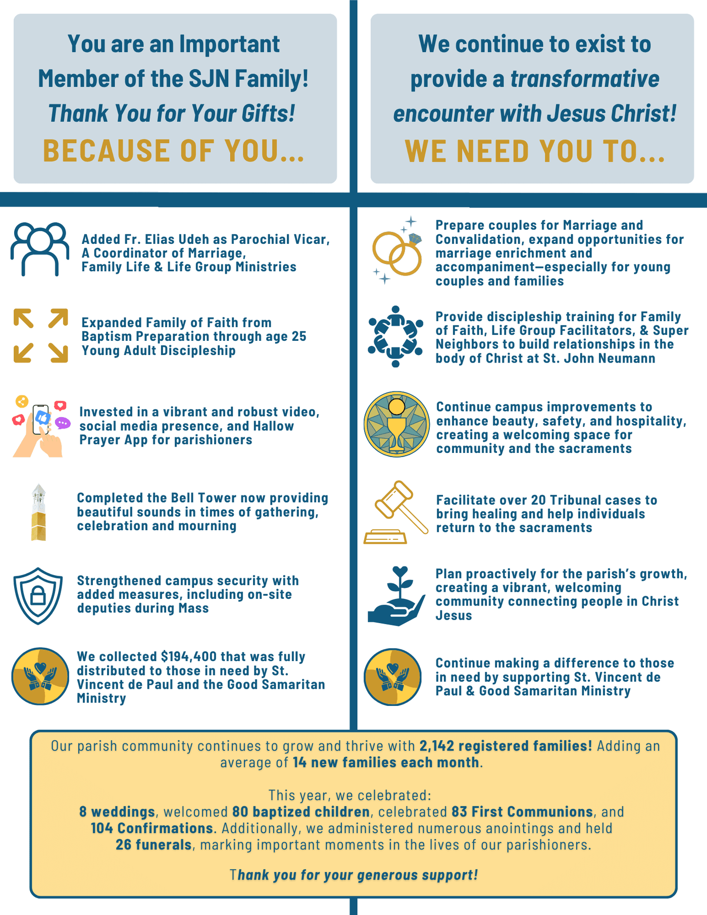 We encourage you to take a moment to pray about how you can support the mission of St. John Neumann. Thank you for your ongoing generosity!